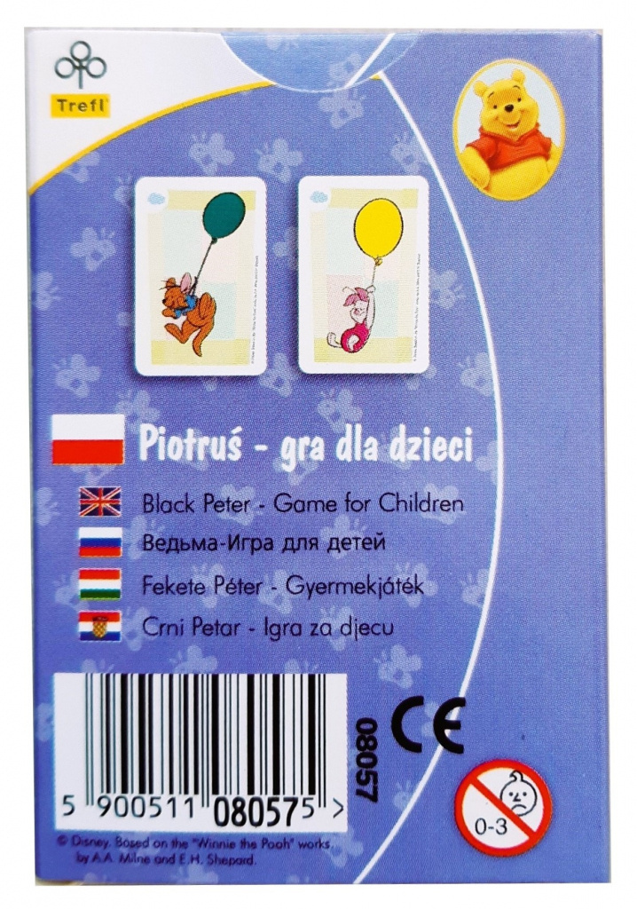 Známa spoločenská kartová hra Čierny Peter od Trefl s Disney motívom Winnie the Pooh. Karty sú balené v papierovej škatuľke s rozmermi 9x6x1 cm. Balenie obsahuje 25 kusov kariet.