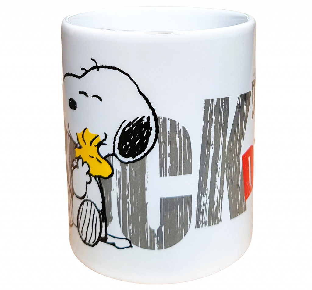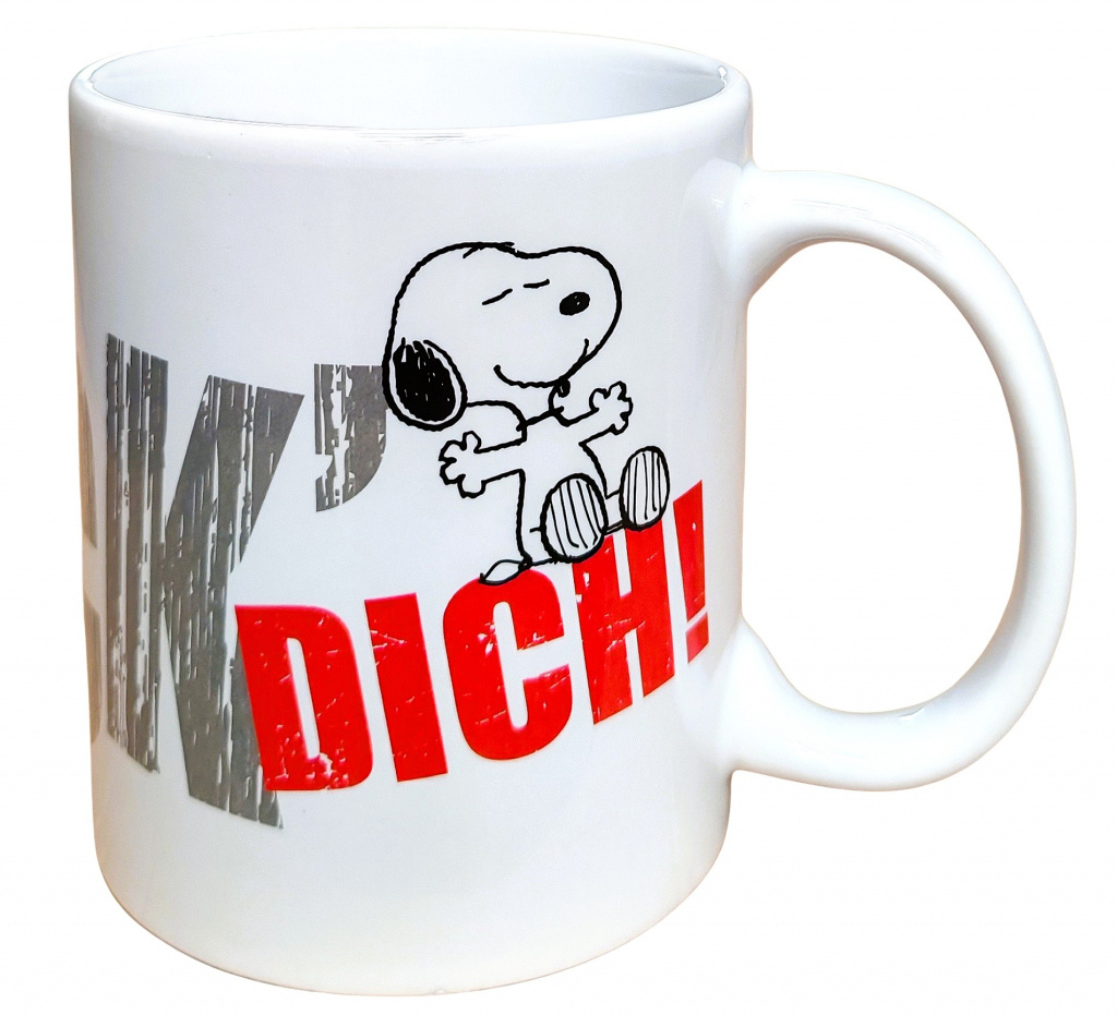 Hrnček ladený do bielej farby má objem 320 ml a je vyrobený z keramiky. Na bielom podklade môžete vidieť psíka Snoopyho s Woodstockom a šedo červený text v nemeckom jazyku Ich druck' dich! (Objímam Ťa!). Hrnček s výškou približne 9,5 cm a s Ø ca. 8 cm sa môže použiť na ohrievanie v mikrovlnnej rúre a môže sa umývať v umývačke riadu.