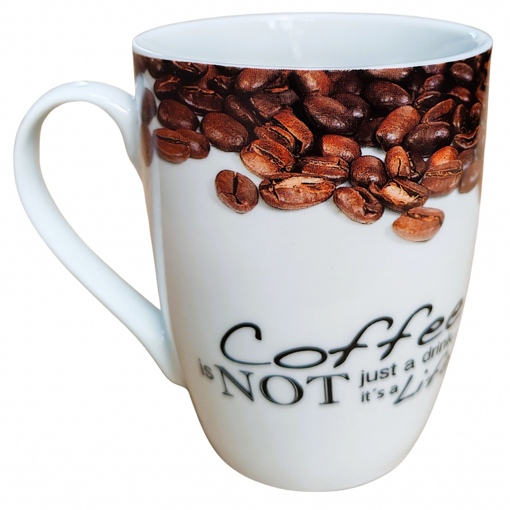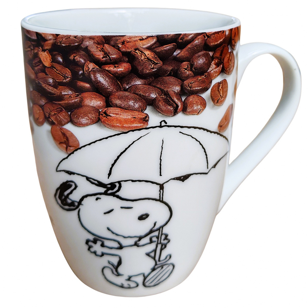 Hrnček bielej farby, s objemom 300 ml je vyrobený z kvalitného porcelánu a môžete na ňom vidieť psíka Snoopyho s dáždnikom a s kávovými zrnkami a text pre správnych kávičkárov v anglickom jazyku Coffee is NOT just a drink...it's a Lifestyle (Káva NIE je len nápoj, je to životný štýl).