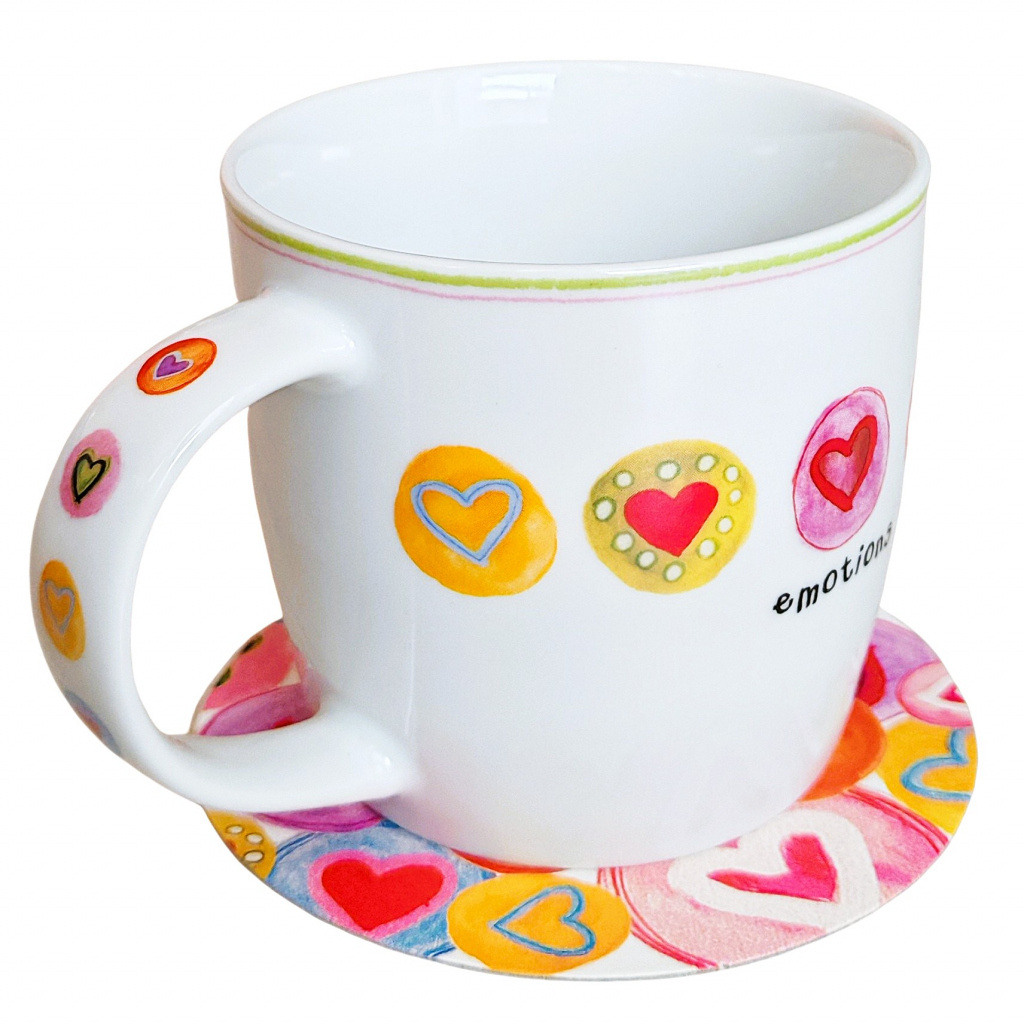 Okrem porcelánového hrnčeka so srdiečkami s výškou približne 8,3 cm a s Ø ca. 8,5 cm nájdete v balení aj dve okrúhle kartónové podložky pod šálku v srdiečkovom dizajne s Ø ca. 10,7 cm.