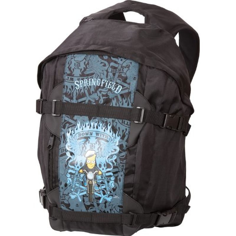 Batoh je vyrobený z kvalitného 900 D polyesteru a je čiernej farby. Na prednej strane batohu vidieť nepolepšiteľného Barta Simpsona na motorke a nápis Springfield.