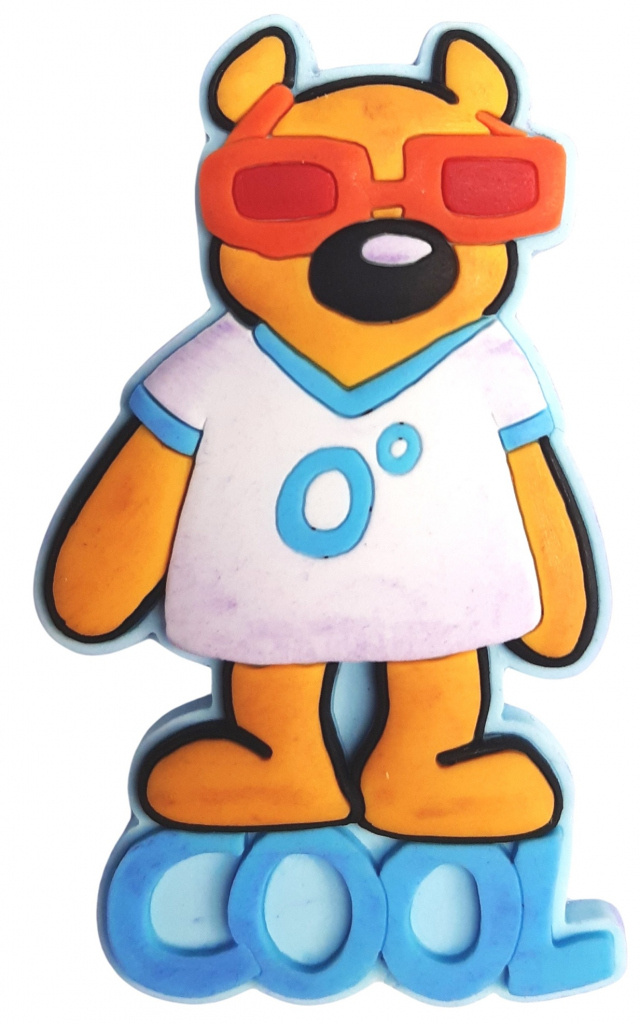 Magnetka Medveď Bono v žlto oranžovej a čiernej farbe v bielo modrom tričku 0° má modrý text v anglickom jazyku COOL a vďaka magnetu si ju môžete dať na chladničku alebo iný povrch vhodný pre magnety. Je vyrobená z latexu, je umývateľná a má rozmery približne 6,5x3,5 cm.