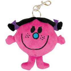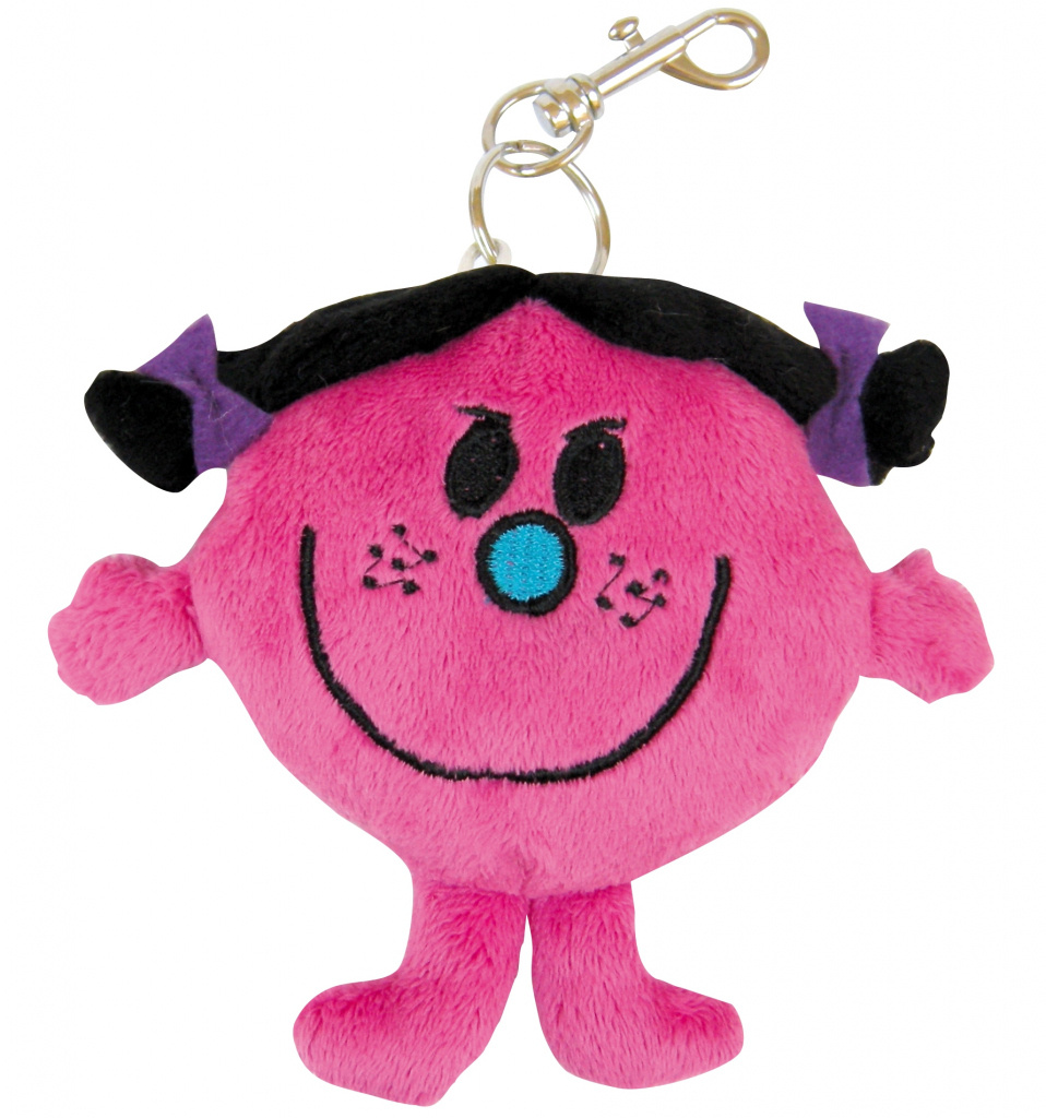 Plyšová kľúčenka Little Miss v okrúhlom tvare ružovej farby s čiernymi vlasmi a s fialovými mašľami je vyrobená z polyesteru a má kovovú karabínku s kovovým krúžkom na zavesenie a malý prívesok so značkou Mr. Men Little Miss.