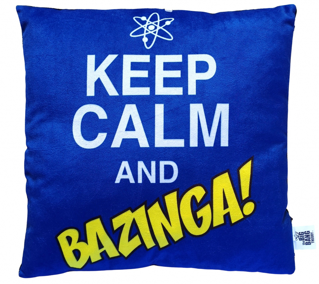 Predná strana vankúša je modrej farby a môžete na nej vidieť text v anglickom jazyku KEEP CALM AND BAZINGA! (Zachovajte pokoj a Bazinga!). Zadná strana vankúša je čiernej farby bez potlače.