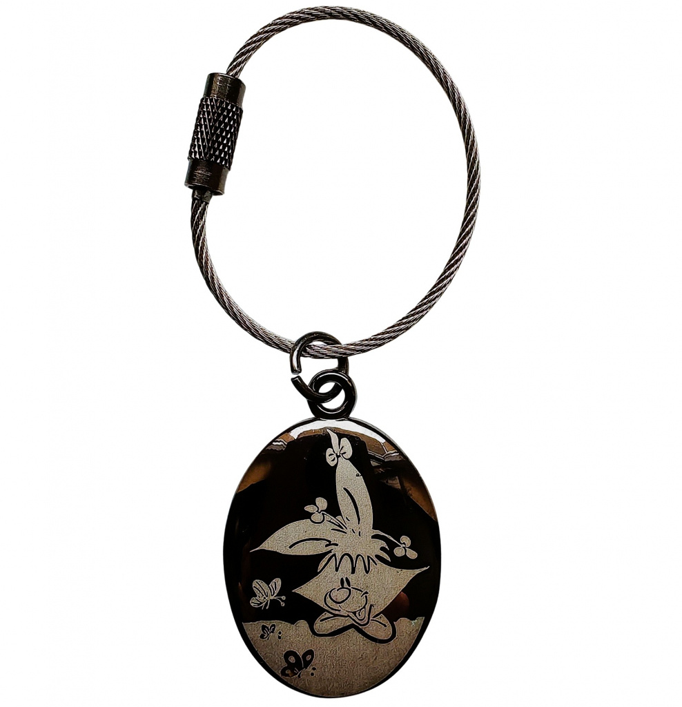 Diddl&Friends kľúčenka v oválnom tvare je vyrobená z kovu a má otvárateľné kovové lanko, ktoré má Ø približne 3,5 cm v užšej časti a ca. 4 cm v širšej časti. Kovové lanko sa dá otvoriť krútením spojovacieho uzáveru. Na lanko je tak možné zavesiť kľúče, ďalšie prívesky alebo si prívesok zavesiť napríklad na tašku.