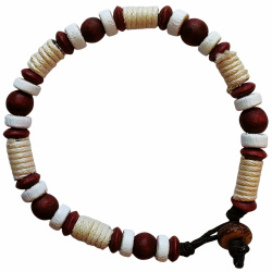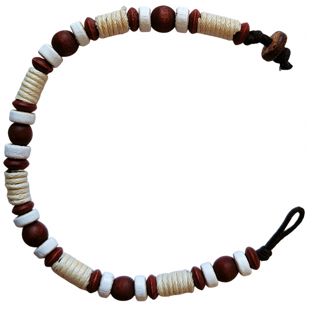 Náramok s drevenými korálkami tmavohnedej a bielej farby a s priadzou má dĺžku približne 19 cm. Náramok má zapínanie na drevený gombík s priemerom ca. 8 mm. Náramok bol navrhnutý spoločnosťou Essania a vyrobený na Filipínach.
